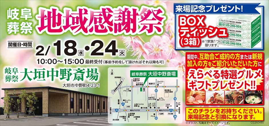 <岐阜県>【2月18日、24日 岐阜葬祭 大垣中野斎場 地域感謝祭】お葬式や相続のわからないこと、じっくり聞けるイベント☆参加無料☆