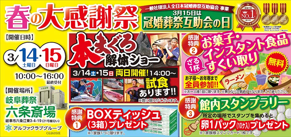 <岐阜県>【3月14日~15日 岐阜葬祭 六条斎場 冠婚葬祭互助会の日 春の大感謝祭】お葬式や相続のわからないこと、じっくり聞けるイベント☆参加無料☆