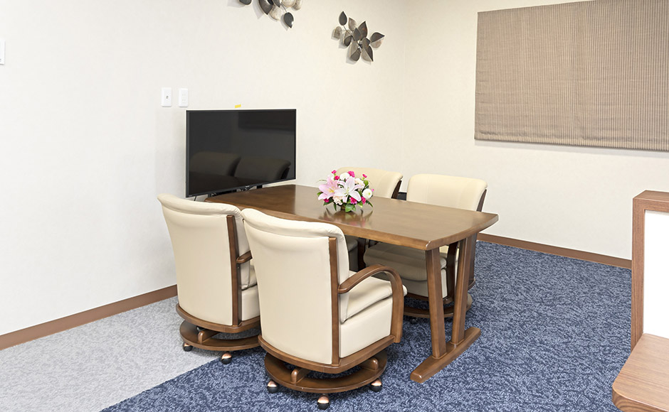 ワンフロアーで使用しやすい式場になっております。ベッドルームやお風呂も完備しております。モダンで落ち着いた部屋で故人様とゆっくりとお過ごしできる家族葬の式場です。