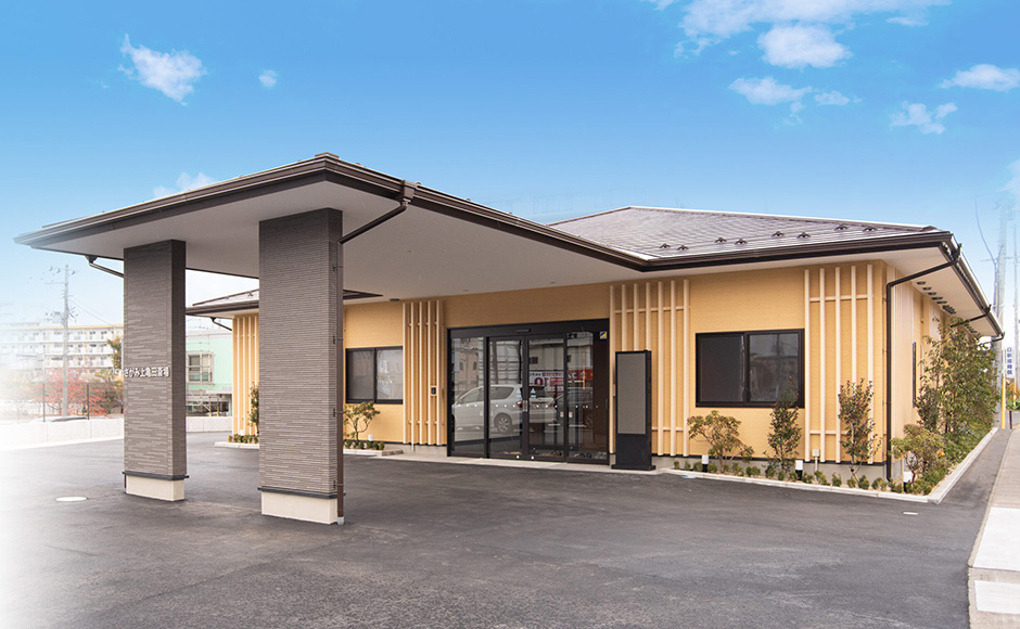 緑の囲まれた安らぎの空間での一日一組のお葬式を貸し切りで行えます。会場最大60名収容、会食人数最大30名、駐車場台数20台の会場で親しい方々でゆっくりとお別れして頂く家族葬や少人数の葬儀に最適な会場です。遺族親族の控室を完備しベットルームでの休憩スペースがあります。バリアフリー構造です。法事法要にも利用できます。