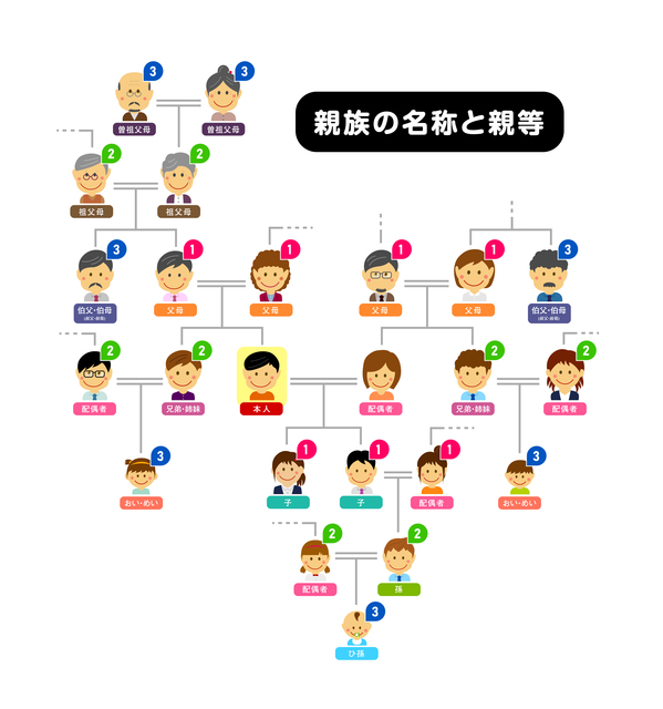 一親等:本人の父母、配偶者の父母、子、子の配偶者