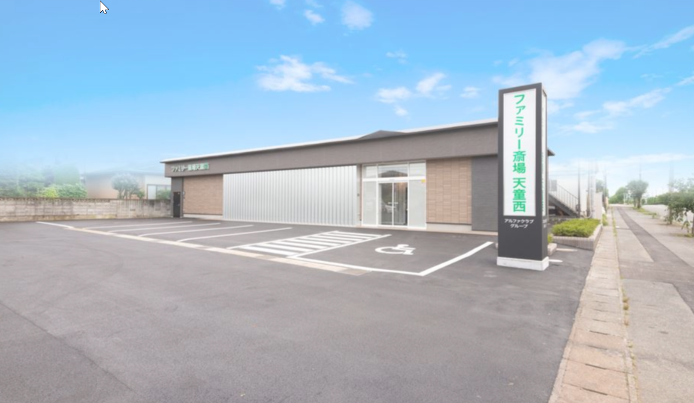 ファミリー斎場天童西は、天童駅から徒歩10分の好立地にある葬儀場です。家族葬から小規模の一般葬まで対応した式場。小規模の式場ですので、故人とのゆっくりとしたお別れができます。