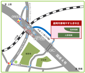 盛岡駅または盛岡バスセンターから愛宕町バス停下車 徒歩約15分 JR盛岡駅からタクシー 約10分 <火葬場に来場するとき> 上田方面から:国道4号線から火葬場への取付道路を左折 茶畑方面から:国道4号線から火葬場へ右折できないため寺山橋より <火葬場から帰るとき> 上田方面へ:寺山橋より 茶畑方面へ:国道4号線を左折可 |