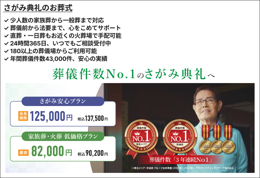日立市をはじめ福島や関東・東北エリアに180カ所の施設をご用意し、地域密着の葬儀を60年以上・年間43,000件以上お手伝いしている「さがみ典礼」では、専門スタッフが24時間365日いつでも丁寧にご相談を受け付けています。