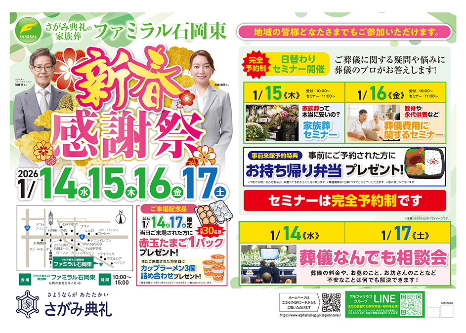 <茨城県>【1月14日~17日 家族葬のファミラル石岡東 新春感謝祭】お葬式や相続のわからないこと、じっくり聞けるイベント☆参加無料☆