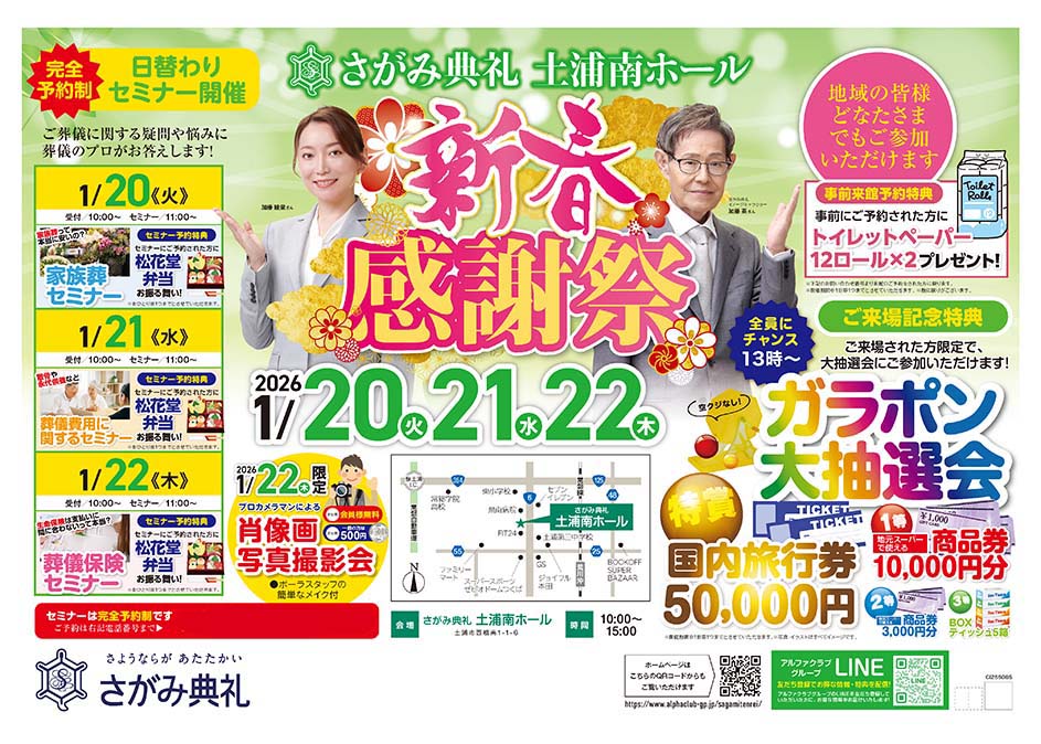 <茨城県>【1月20日~22日 さがみ典礼 土浦南ホール 新春感謝祭】お葬式や相続のわからないこと、じっくり聞けるイベント☆参加無料☆