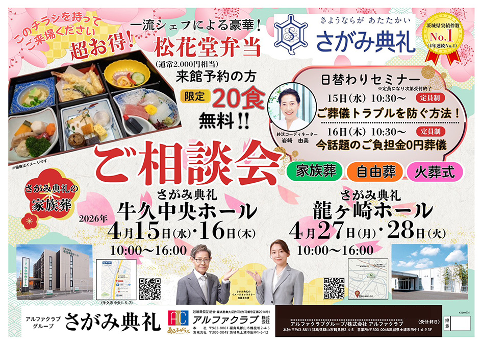 <茨城県>【4月15日~16日 さがみ典礼 牛久中央ホール ご相談会】お葬式や相続のわからないこと、じっくり聞けるイベント☆参加無料☆