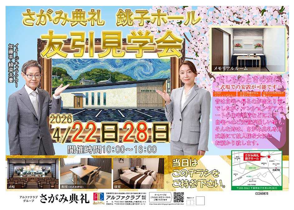 <千葉県>【4月22日、28日 さがみ典礼 銚子ホール 友引見学会】お葬式や相続のわからないこと、じっくり聞けるイベント☆参加無料☆