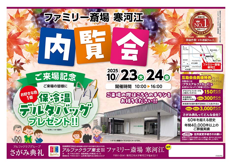 <山形県>【10月23日~24日 ファミリー斎場 寒河江 内覧会】お葬式や相続のわからないこと、じっくり聞けるイベント☆参加無料☆