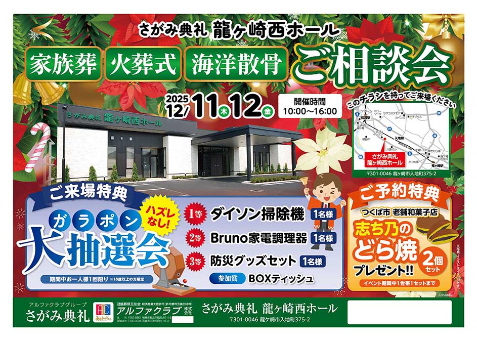 <茨城県>【12月11日~12日 さがみ典礼 龍ヶ崎西ホール 家族葬・火葬式・海洋散骨 ご相談会】お葬式や相続のわからないこと、じっくり聞けるイベント☆参加無料☆
