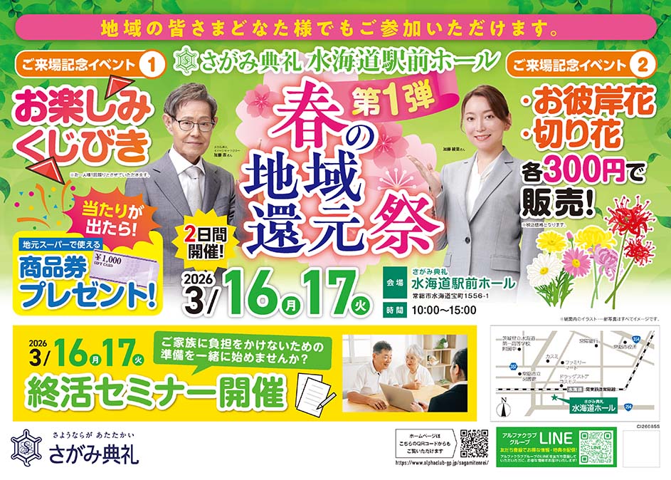 <茨城県>【3月16日~17日 さがみ典礼 水海道駅前ホール 春の地域還元祭】お葬式や相続のわからないこと、じっくり聞けるイベント☆参加無料☆