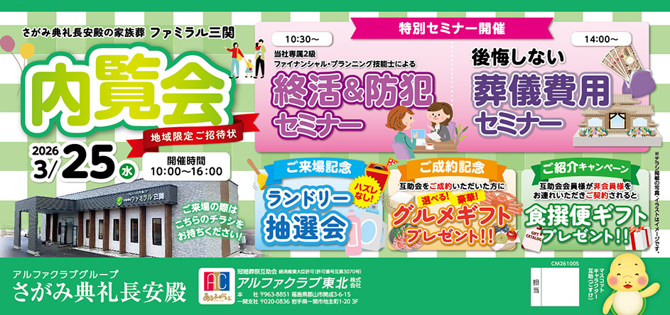 <岩手県>【3月25日 家族葬のファミラル三関 内覧会】お葬式や相続のわからないこと、じっくり聞けるイベント☆参加無料☆
