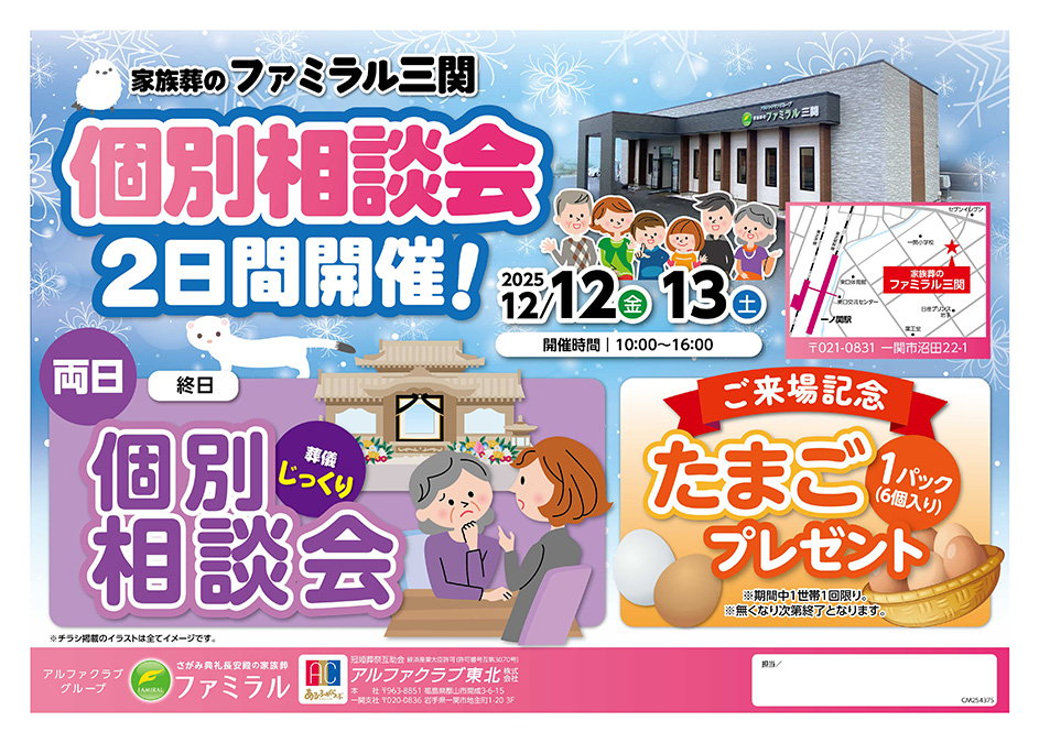 <岩手県>【12月12日~13日 家族葬のファミラル三関 個別相談会】お葬式や相続のわからないこと、じっくり聞けるイベント☆参加無料☆