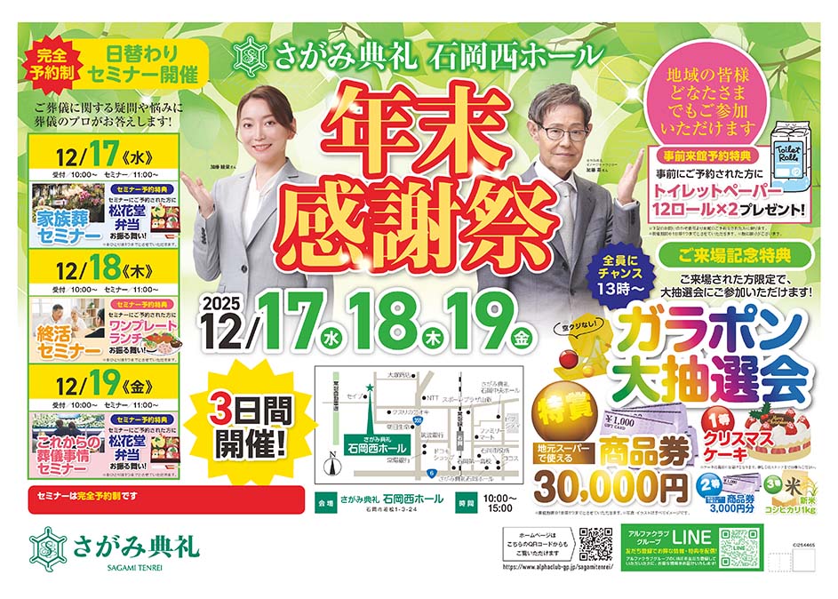<茨城県>【12月17日~19日 さがみ典礼 石岡西ホール 年末感謝祭】お葬式や相続のわからないこと、じっくり聞けるイベント☆参加無料☆
