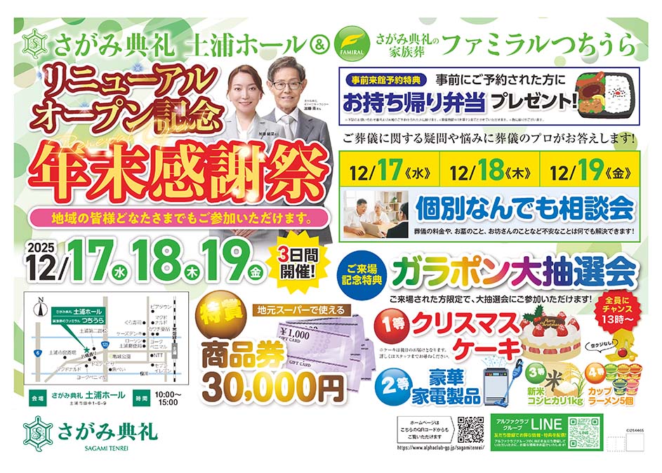 <茨城県>【12月17日~19日 さがみ典礼 土浦ホール&家族葬のファミラルつちうら リニューアルオープン記念年末感謝祭】お葬式や相続のわからないこと、じっくり聞けるイベント☆参加無料☆