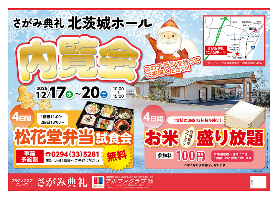 <茨城県>【12月17日~20日 さがみ典礼北茨城ホール 内覧会】お葬式や相続のわからないこと、じっくり聞けるイベント☆参加無料☆