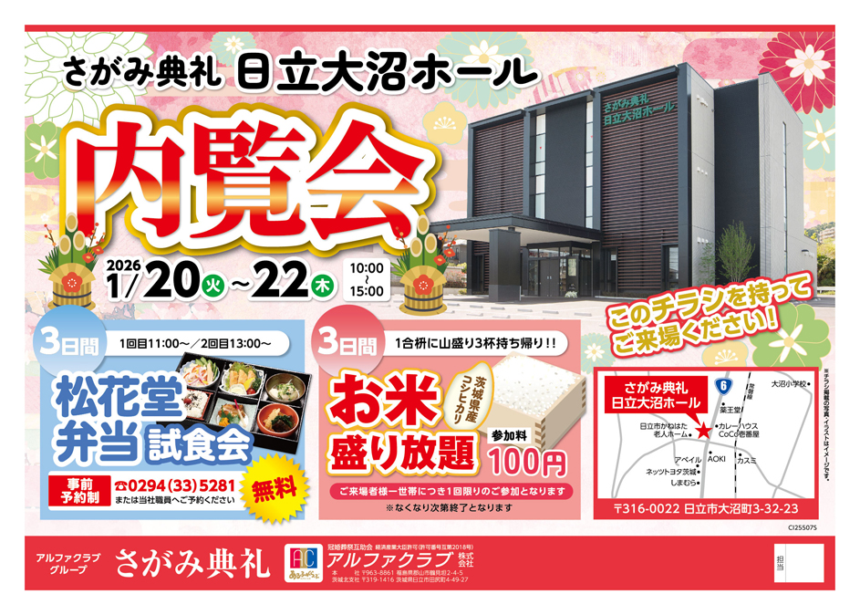 <茨城県>【1月20日~22日 さがみ典礼 日立大沼ホール 内覧会】お葬式や相続のわからないこと、じっくり聞けるイベント☆参加無料☆