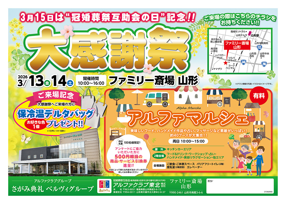 <山形県>【3月13日~14日 ファミリー斎場 山形 冠婚葬祭互助会の日大感謝祭】お葬式や相続のわからないこと、じっくり聞けるイベント☆参加無料☆
