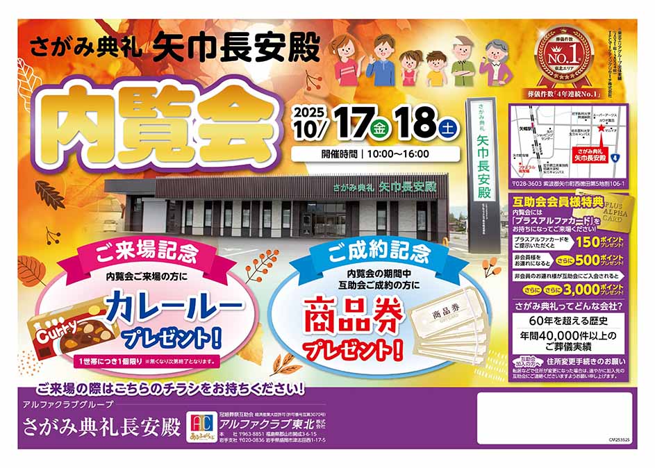 <岩手県>【10月17日~18日 さがみ典礼矢巾長安殿 内覧会】お葬式や相続のわからないこと、じっくり聞けるイベント☆参加無料☆