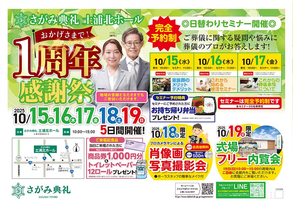 <茨城県>【10月15日~19日 さがみ典礼 土浦北ホール 1周年感謝祭】お葬式や相続のわからないこと、じっくり聞けるイベント☆参加無料☆
