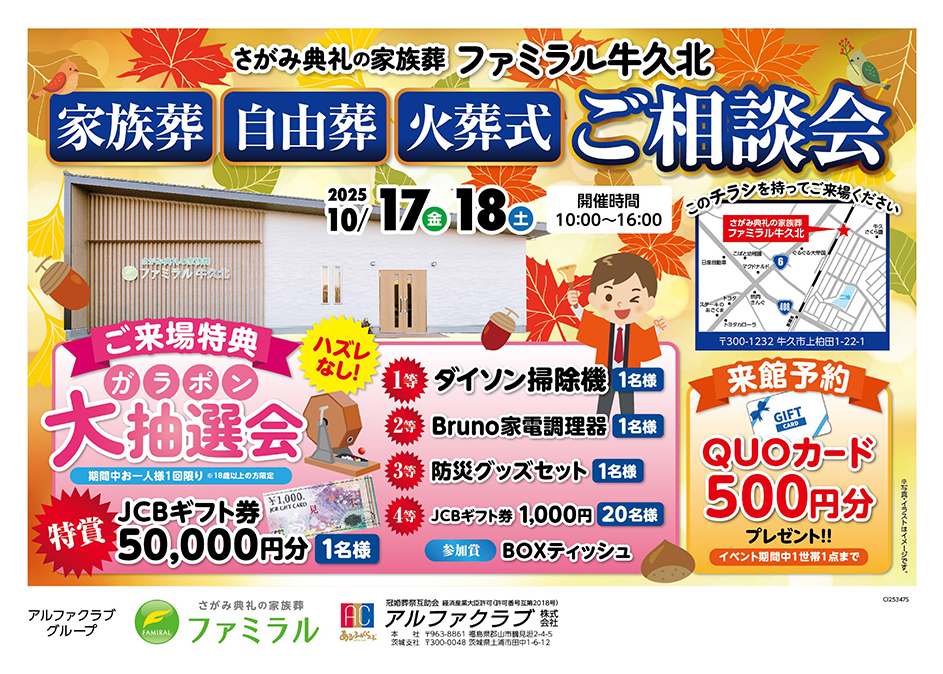<茨城県>【10月17日~18日 家族葬のファミラル牛久北 家族葬 自由葬 火葬式 ご相談会】お葬式や相続のわからないこと、じっくり聞けるイベント☆参加無料☆