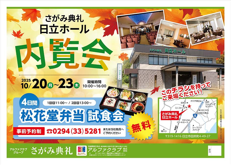 <茨城県>【10月20日~23日 さがみ典礼 日立ホール 内覧会】お葬式や相続のわからないこと、じっくり聞けるイベント☆参加無料☆