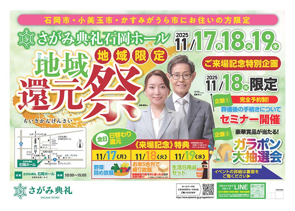 <茨城県>【11月17日~19日 さがみ典礼 石岡ホール 地域還元祭】お葬式や相続のわからないこと、じっくり聞けるイベント☆参加無料☆