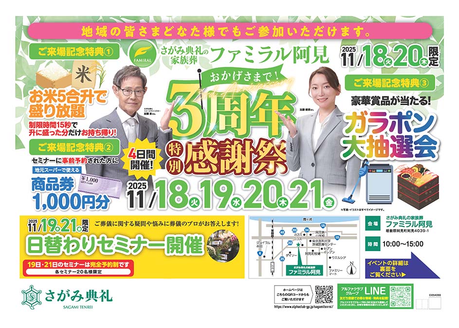 <茨城県>【11月18日~21日 家族葬のファミラル阿見 3周年特別感謝祭】お葬式や相続のわからないこと、じっくり聞けるイベント☆参加無料☆