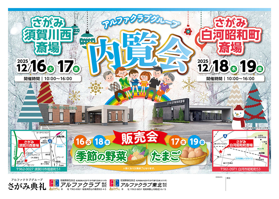 <福島県>【12月18日~19日 さがみ白河昭和町斎場 内覧会】お葬式や相続のわからないこと、じっくり聞けるイベント☆参加無料☆