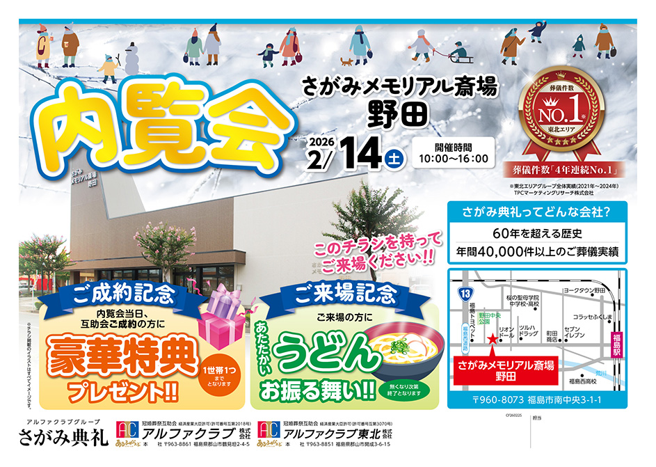<福島県>【2月14日 さがみメモリアル斎場 野田 内覧会】お葬式や相続のわからないこと、じっくり聞けるイベント☆参加無料☆