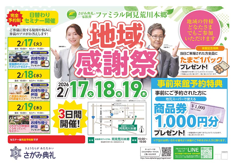 <茨城県>【2月17日~19日 家族葬のファミラル阿見荒川本郷 地域感謝祭】お葬式や相続のわからないこと、じっくり聞けるイベント☆参加無料☆