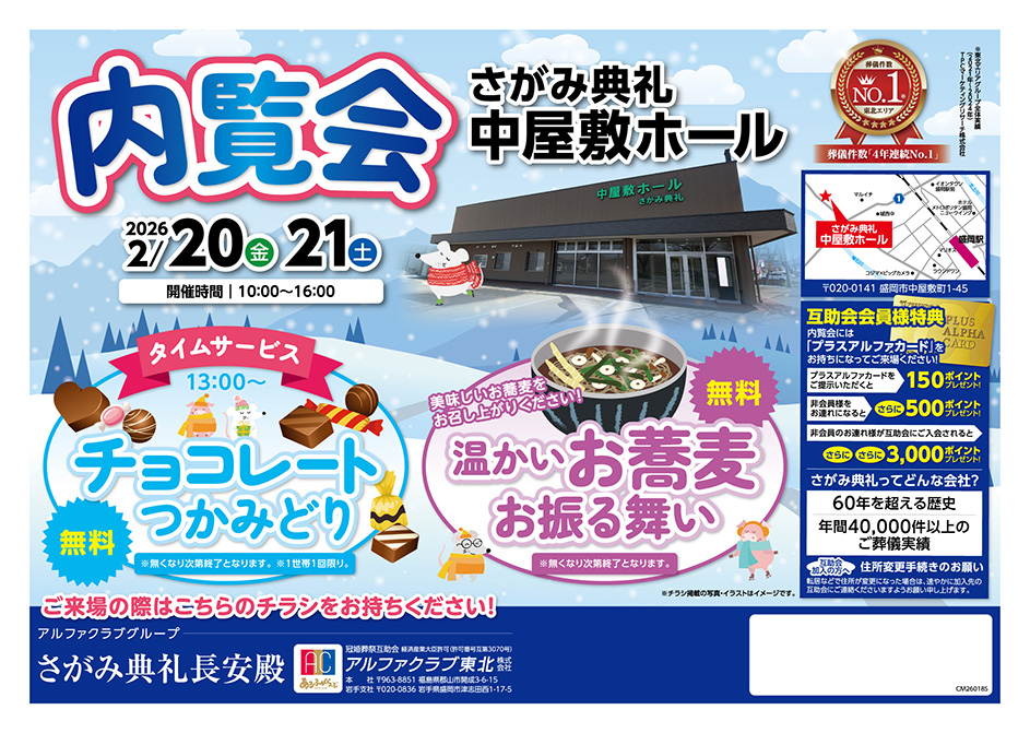 <岩手県>【2月20日~21日 さがみ典礼 中屋敷ホール 内覧会】お葬式や相続のわからないこと、じっくり聞けるイベント☆参加無料☆