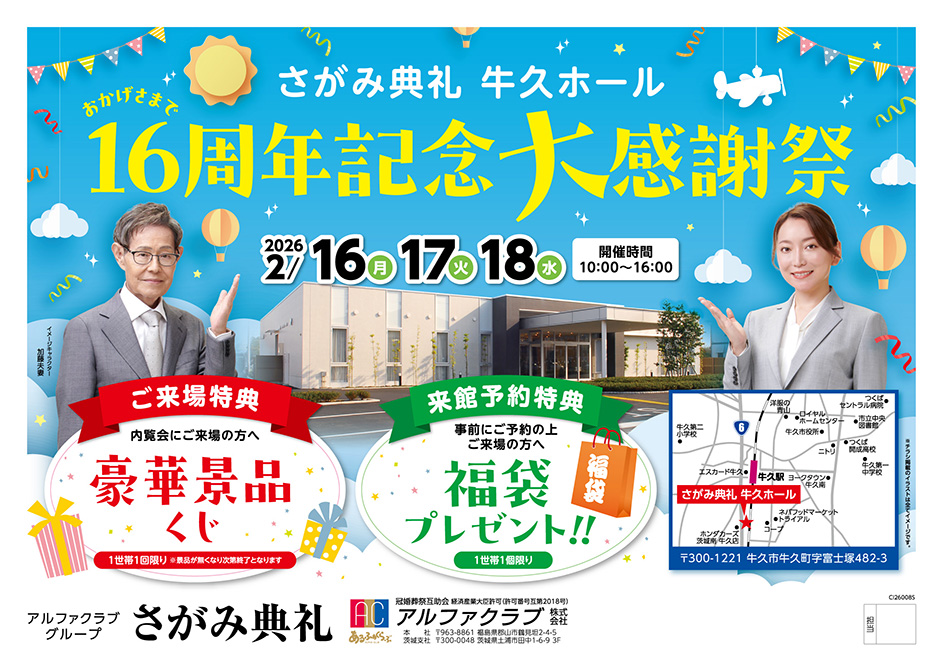 <茨城県>【2月16日~18日 さがみ典礼 牛久ホール 16周年記念大感謝祭】お葬式や相続のわからないこと、じっくり聞けるイベント☆参加無料☆