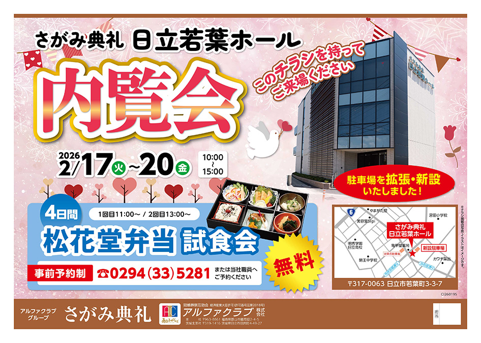 <茨城県>【2月17日~20日 さがみ典礼 日立若葉ホール 内覧会】お葬式や相続のわからないこと、じっくり聞けるイベント☆参加無料☆