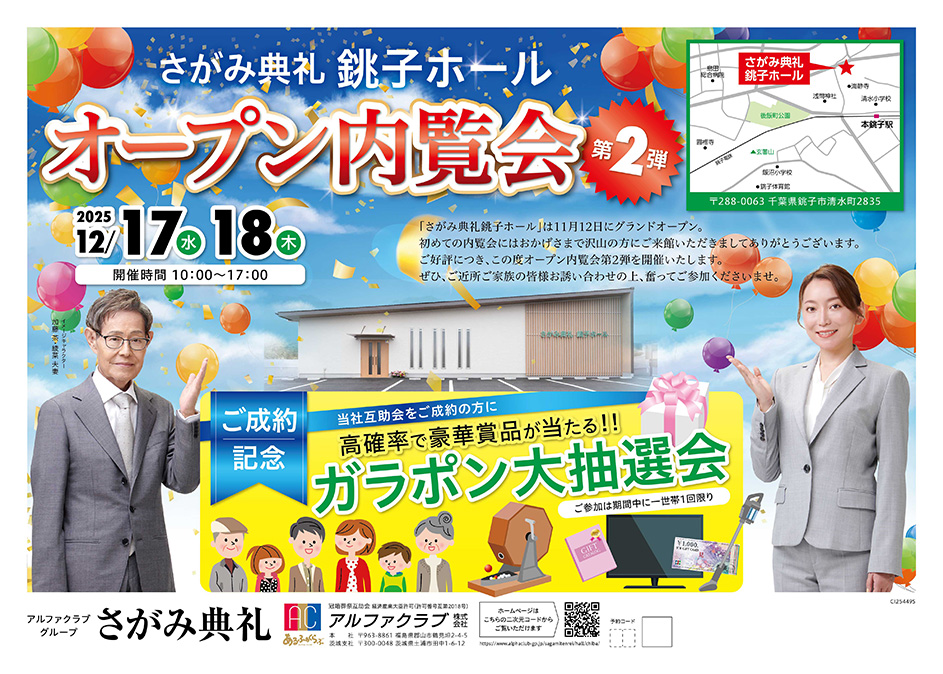 <千葉県>【12月17日~18日 さがみ典礼銚子ホール オープン内覧会第2弾】お葬式や相続のわからないこと、じっくり聞けるイベント☆参加無料☆