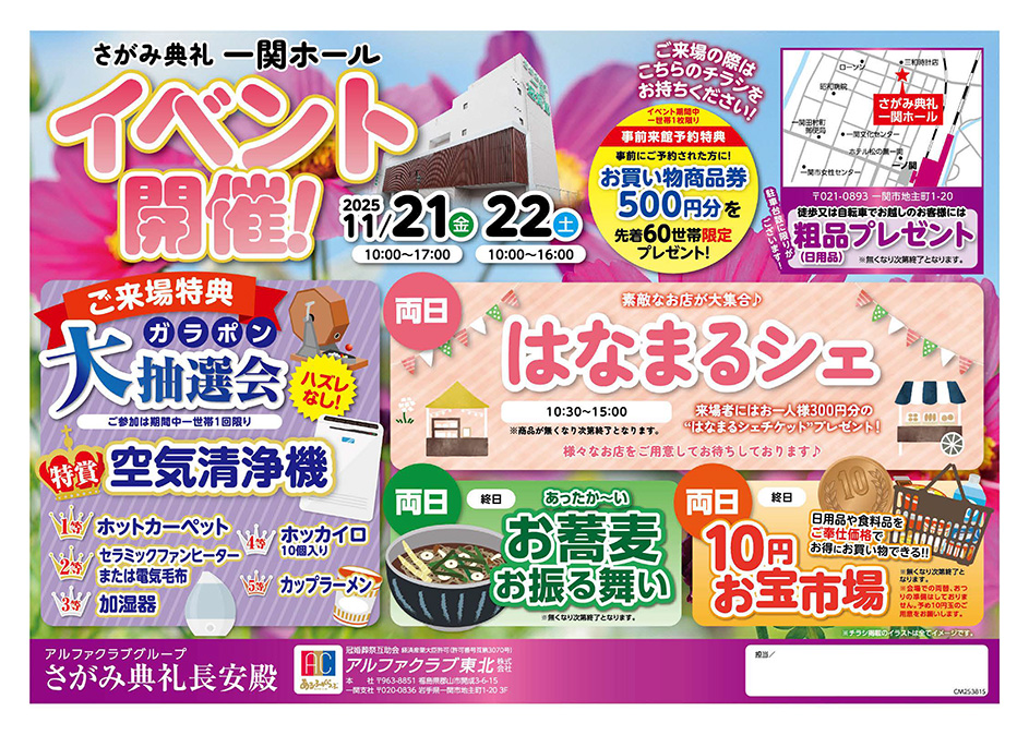 <岩手県>【11月21日~22日 さがみ典礼一関ホール イベント開催!】お葬式や相続のわからないこと、じっくり聞けるイベント☆参加無料☆