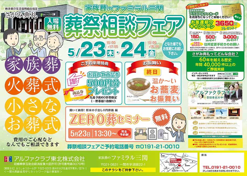 <岩手県>【5月23日~24日 家族葬のファミラル三関 葬祭相談フェア】お葬式や相続のわからないこと、じっくり聞けるイベント☆参加無料☆