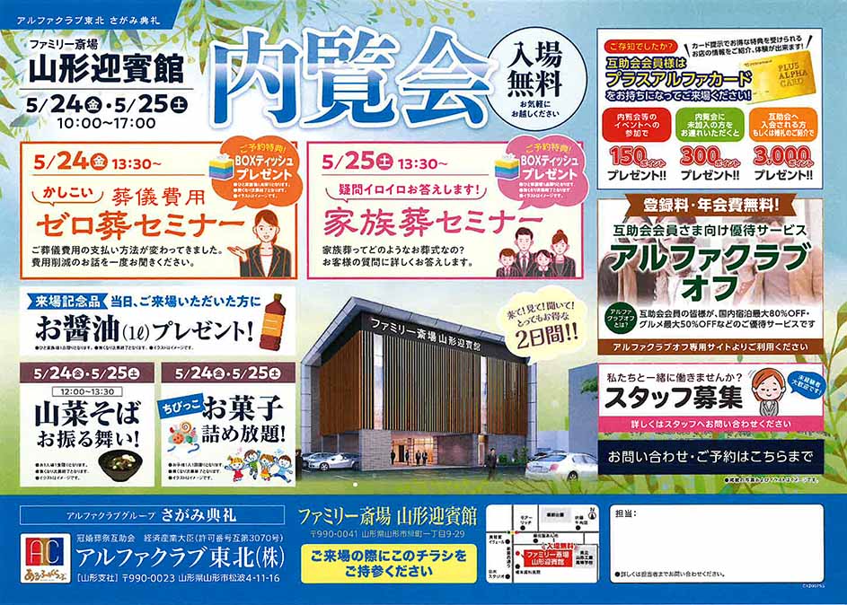 <山形県>【5月24日~25日 ファミリー斎場山形迎賓館 内覧会】お葬式や相続のわからないこと、じっくり聞けるイベント☆参加無料☆