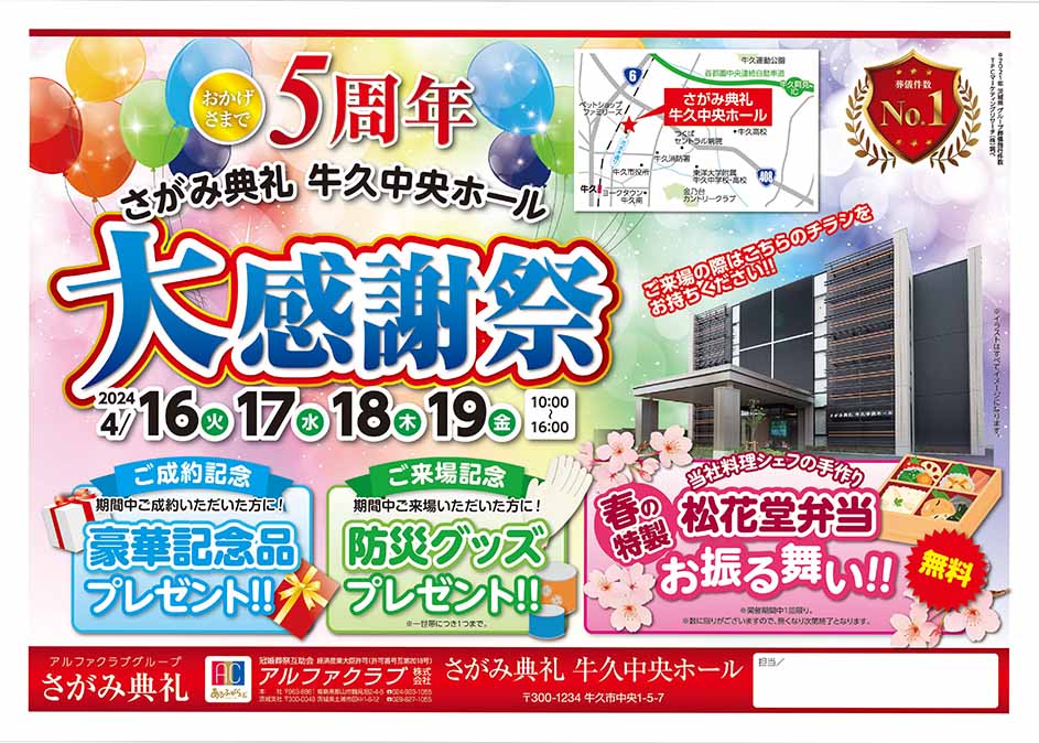 <茨城県>【4月16日~19日 さがみ典礼牛久中央ホール 大感謝祭】お葬式や相続のわからないこと、じっくり聞けるイベント☆参加無料☆