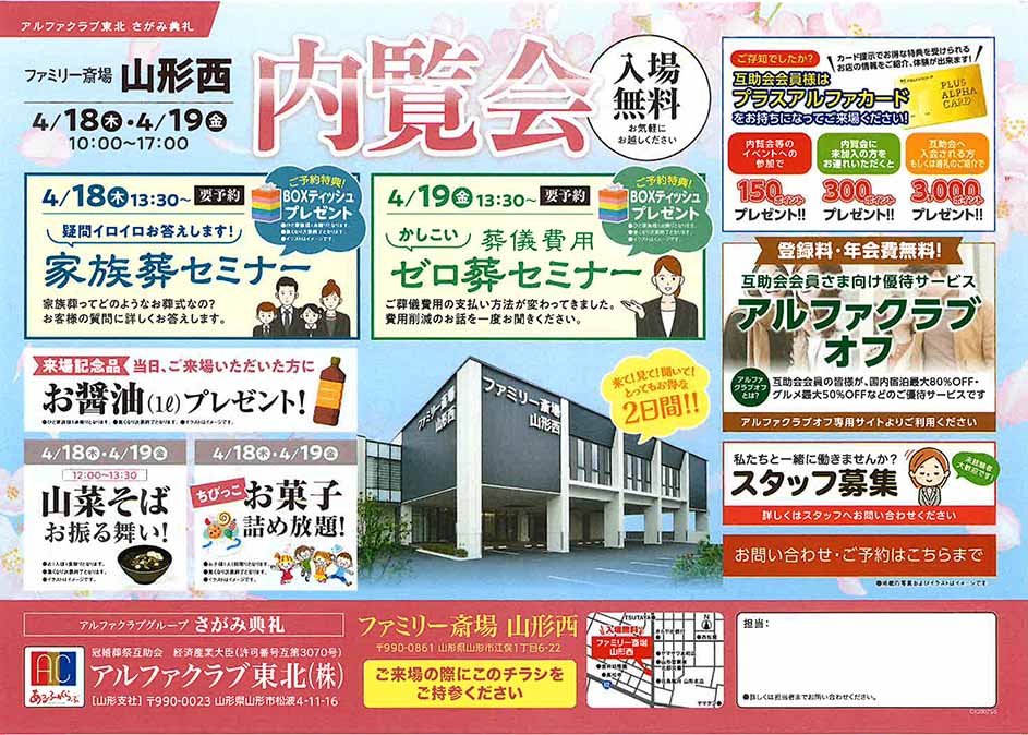 <山形県>【4月18日~19日 ファミリー斎場山形西 内覧会】お葬式や相続のわからないこと、じっくり聞けるイベント☆参加無料☆