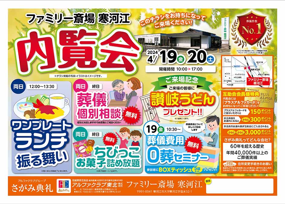 <山形県>【4月19日~20日 ファミリー斎場寒河江 内覧会】お葬式や相続のわからないこと、じっくり聞けるイベント☆参加無料☆