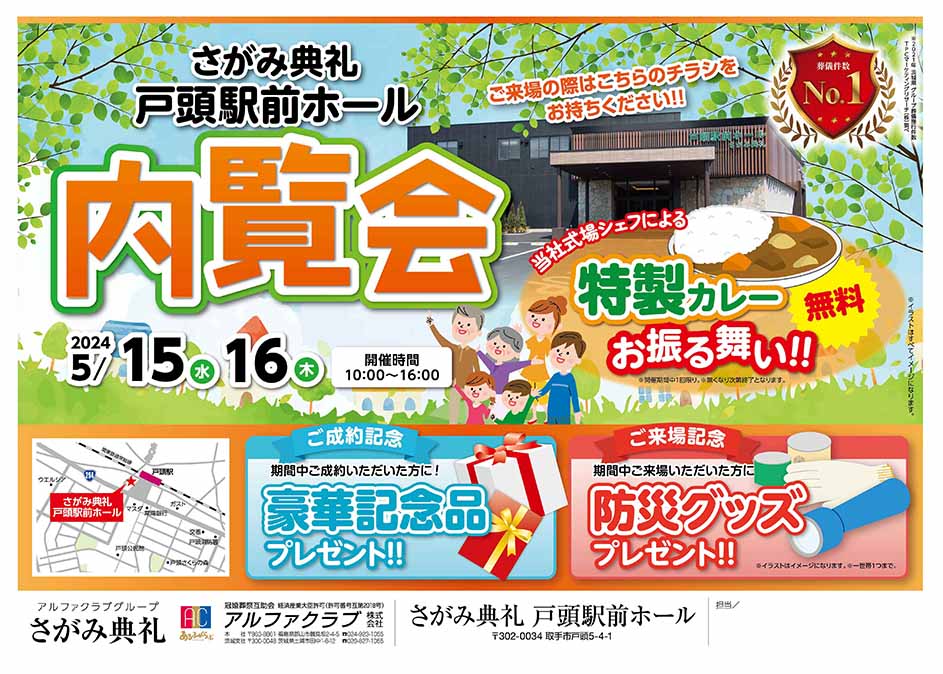 <茨城県>【5月15日~16日 さがみ典礼戸頭駅前ホール 内覧会】お葬式や相続のわからないこと、じっくり聞けるイベント☆参加無料☆