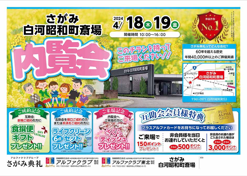 <福島県>【4月18日~19日 さがみ白河昭和町斎場 内覧会】お葬式や相続のわからないこと、じっくり聞けるイベント☆参加無料☆