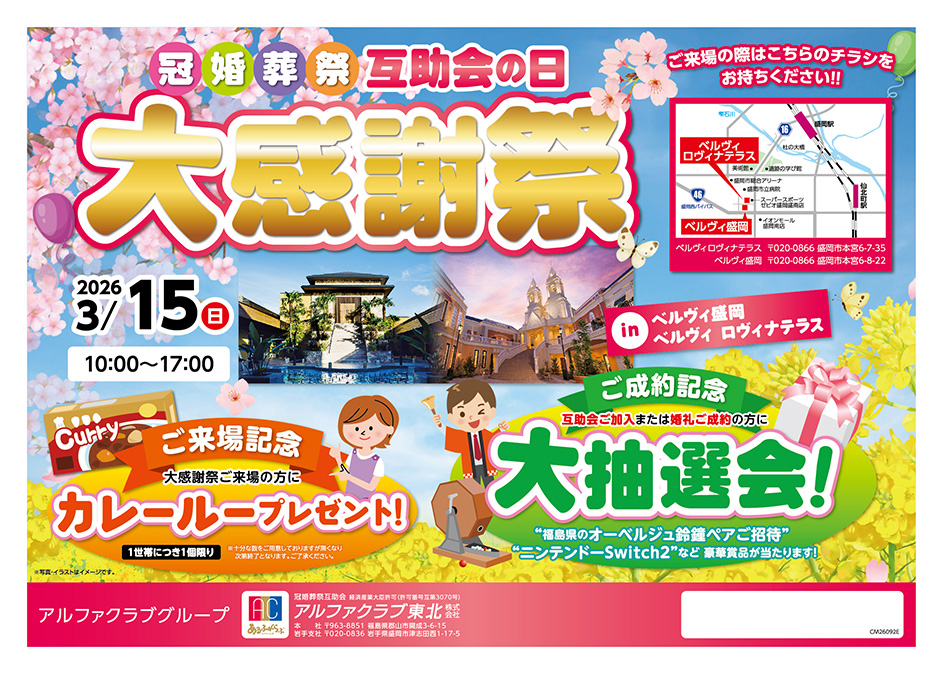 <岩手県>【3月15日 ベルヴィ盛岡・ロヴィナテラス 冠婚葬祭互助会の日大感謝祭】お葬式や相続のわからないこと、じっくり聞けるイベント☆参加無料☆