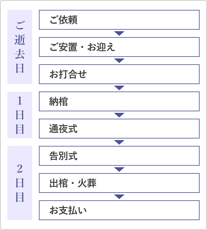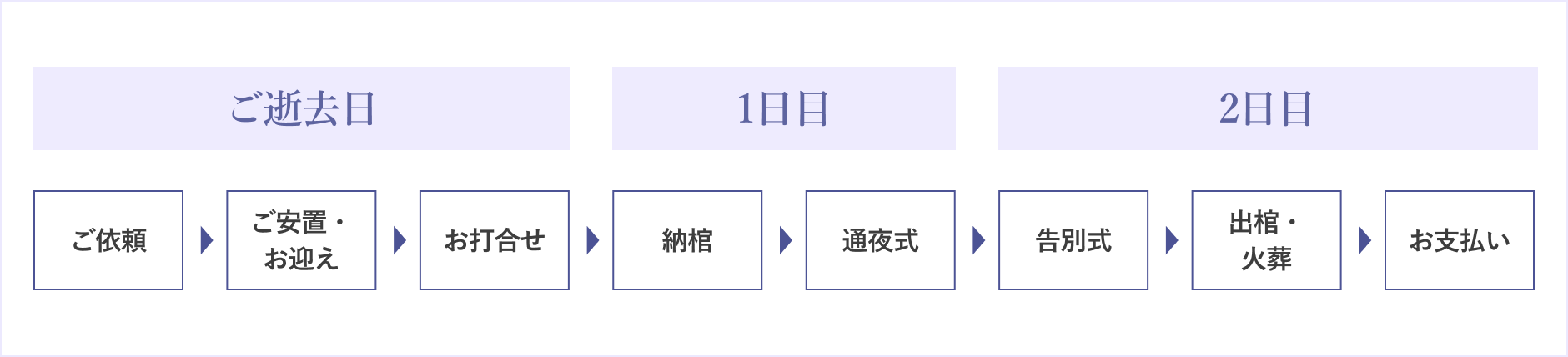 | 流れ | 安置→通夜式→告別式→火葬 |